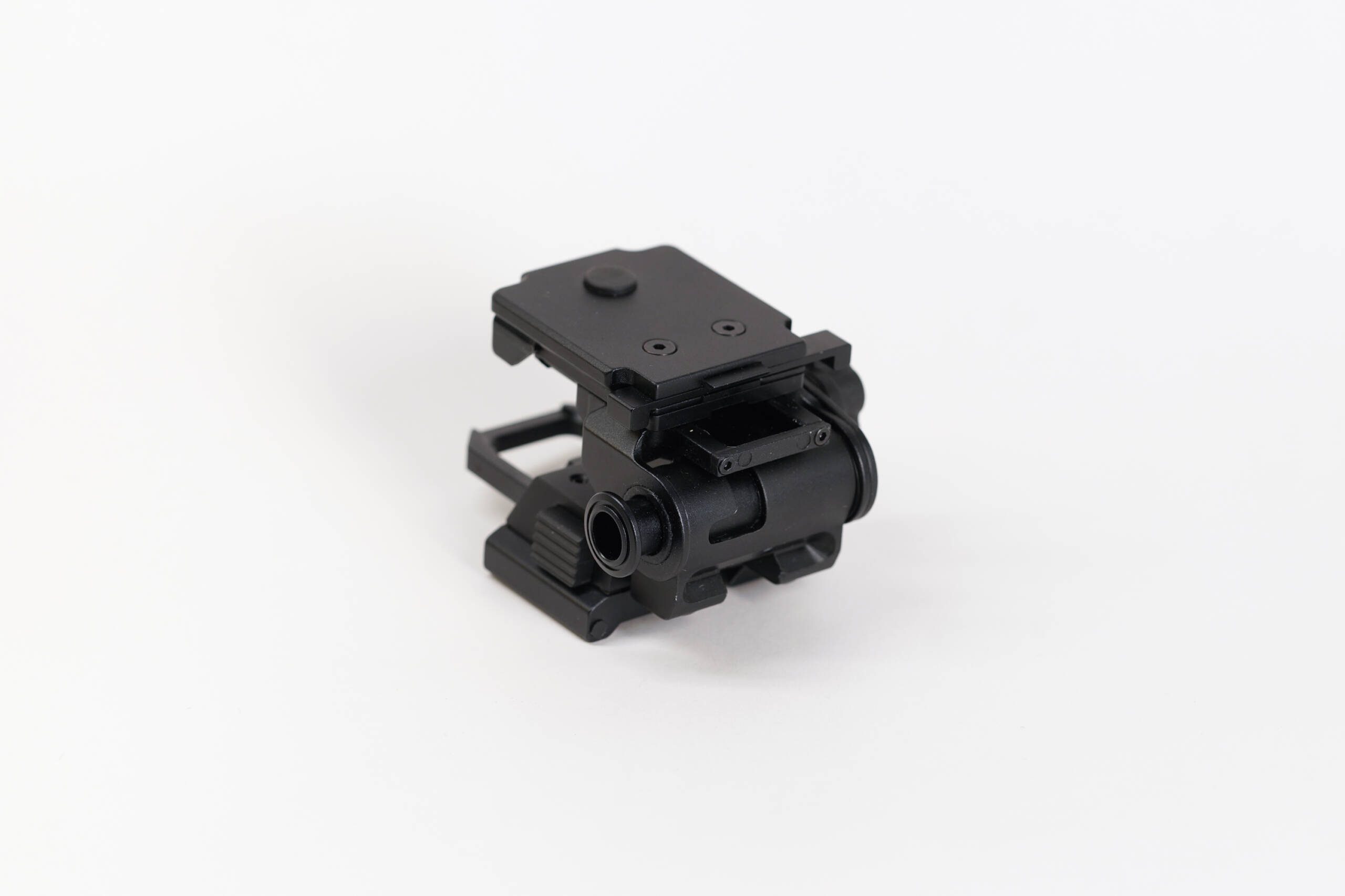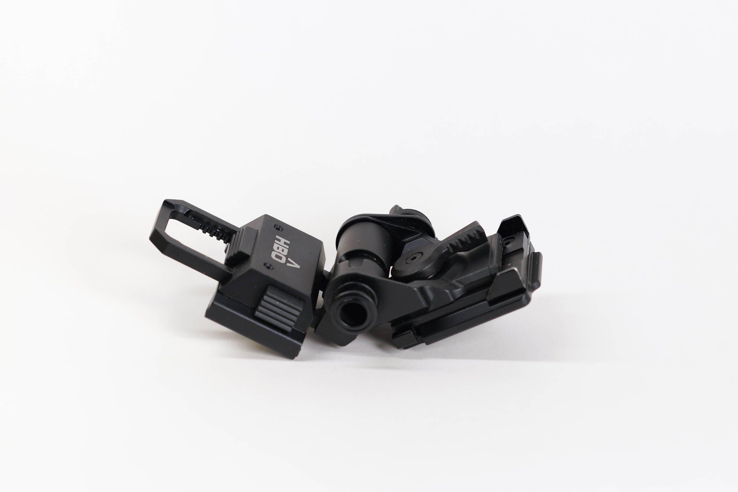 Optimized for single-handed operation, the mount allows quick deployment, stowage, and adjustment in dynamic environments. An integrated safety breakaway mechanism is designed to automatically release from the helmet interface if excessive force or G-load is encountered—helping reduce the risk of entanglement and neck injury during movement, airborne operations, or impact events.